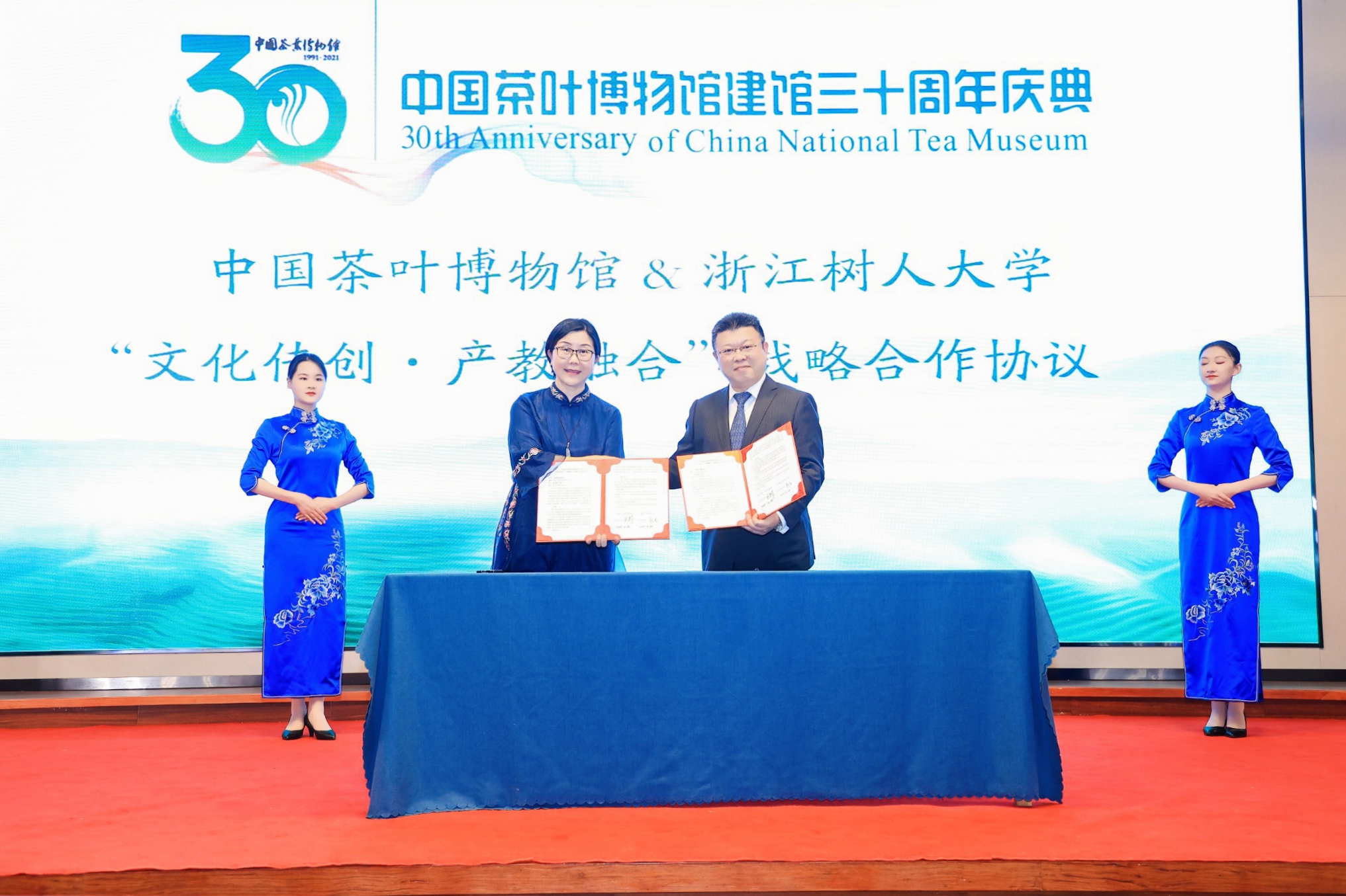 作为庆典的重要议程之一,章清与中国茶叶博物馆馆长包静在现场签署了以“文化传创·产教融合”为主题的战略合作协议。双方约定,今后将共同发力联手打造 “校馆融合”,共塑覆盖育人、文创交流的“茶美协同体”,重点聚焦于“协同育人、文化智库、国际交流”等方面的合作。双方将努力构筑“产教融合”茶文化人才共育体;打造“校馆共建”茶文化国际交流中心;创建“文化传创”茶文化智库,进一步落地战略合作规划。