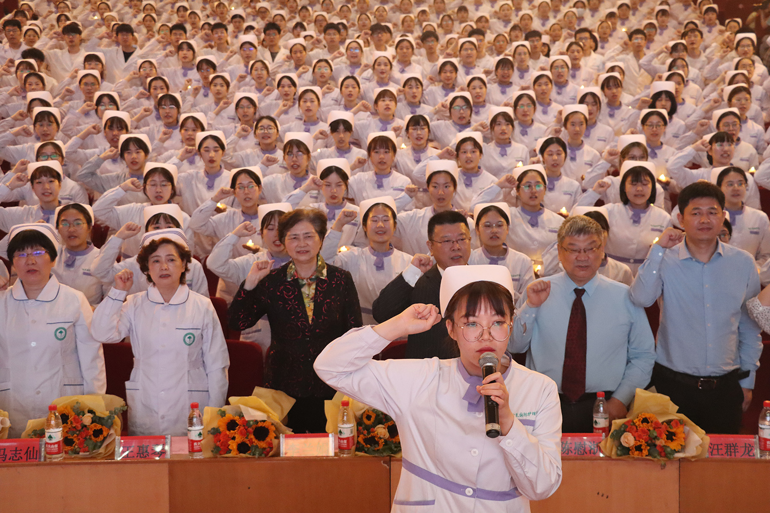 随后,是庄严的宣誓仪式,“我宣誓,永志今日的决心和誓言,接过前辈手中的蜡烛,燃烧自己,照亮别人,把毕生精力献给护理事业……”一句句誓言回荡在树人礼堂中,在闪烁的烛光中荡漾,代表的是同学们对南丁格尔精神与事业的认同和继承。