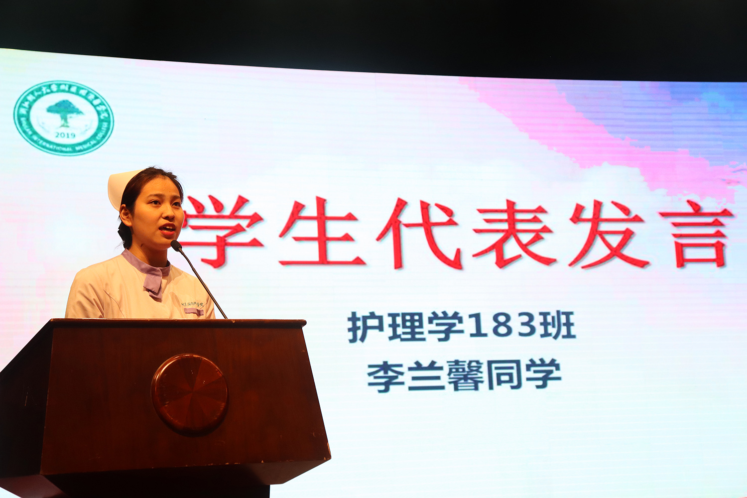 李兰馨同学作为优秀学生代表发言,她表示同学们将在带教老师的指导下通过自己的努力迅速成长,与护士前辈们共同谱写华丽的篇章,让平凡的语言、平凡的工作成就生命的辉煌!