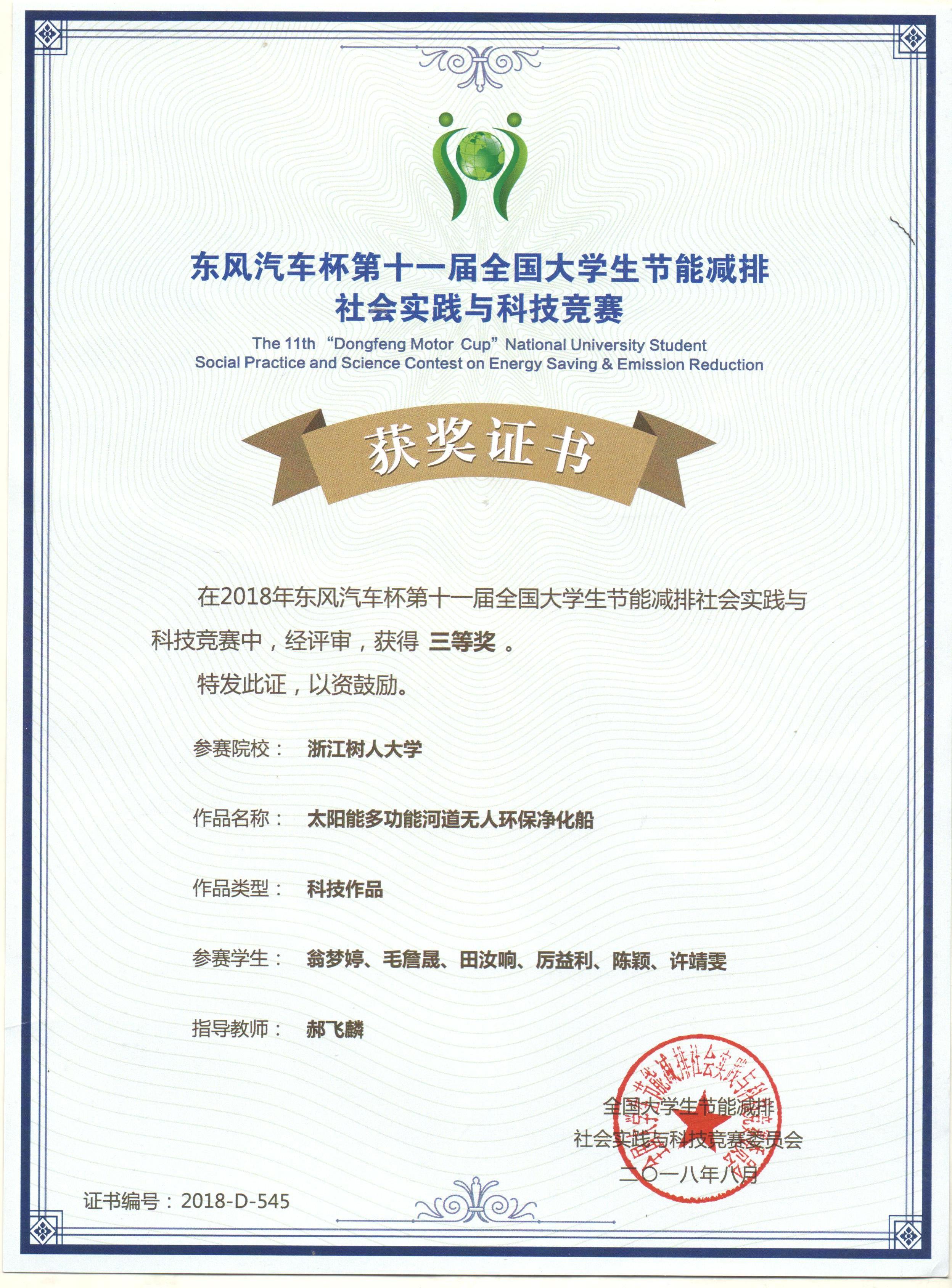 2018年8月7日—9日,由教育部高等教育司主办、武汉理工大学承办的第十一届全国大学生节能减排社会实践与科技竞赛决赛落下帷幕。首次参赛的浙江树人大学(浙江树人学院)生物与环境工程学院2支团队喜获三等奖2项。